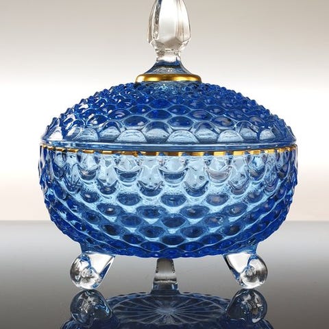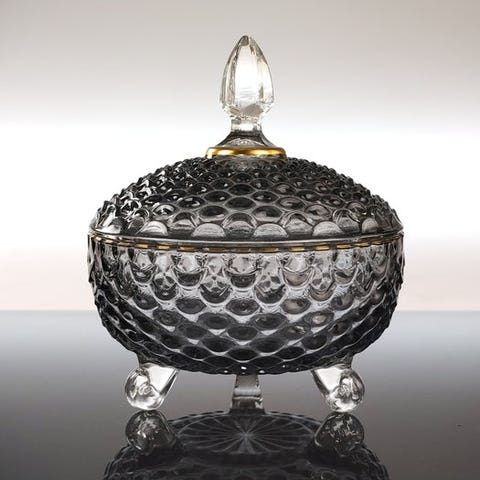 Bonbonæske med 3 fødder (sweet-box) fremstillet med ravemalje og guldblad på glas.