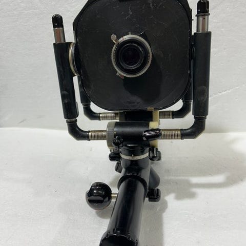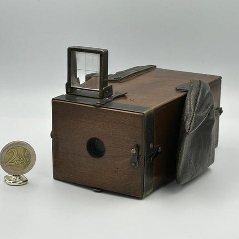 Louis Van Neck 13x18 rejsekamera i meget god fysisk stand med ikke testet funktionstilstand, udstyret med Rapid Rectilinear-objektiv, mahogni-lakeret krop, originalt bordeaux læderbælte og ramme til 13×18 cm glassplade (lukket: 17×8×25 cm; åben: 17×30×25 cm). Klik på den blå "gå til varen" knap, for at købe eller byde på denne vare. Den samlede pris vil blive vist inden du afgiver dit bud.