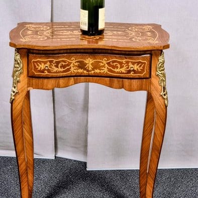 Elegant træsidebord fra Frankrig fra 1970'erne, 73 cm høj, 50 cm bred, 24 cm dyb, med skuffe, i god brugt stand med mindre aldersmærker. Klik på den blå "gå til varen" knap, for at købe eller byde på denne vare. Den samlede pris vil blive vist inden du afgiver dit bud.