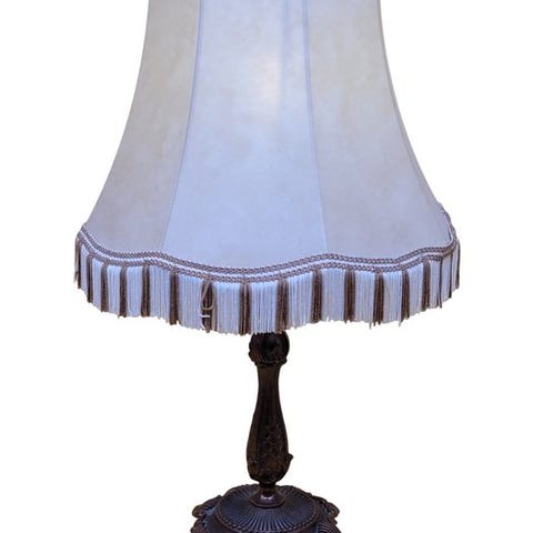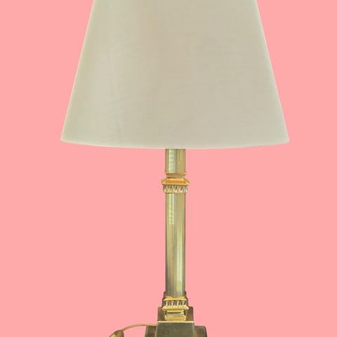tilbudt er en elegant bordlampe i klassicistisk stil med kanneleret søjleform og kvadratisk sokkel. Lampen overrasker med sin høje kvalitet i udførelsen, guldfarvede metaloverflader og en enkel cremefarvet lampskærm, der giver et behageligt, varmt lys.