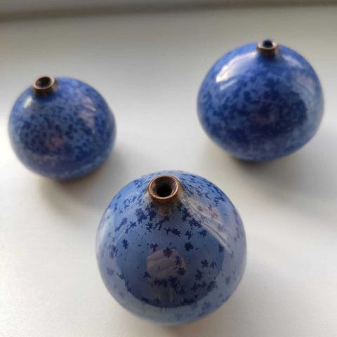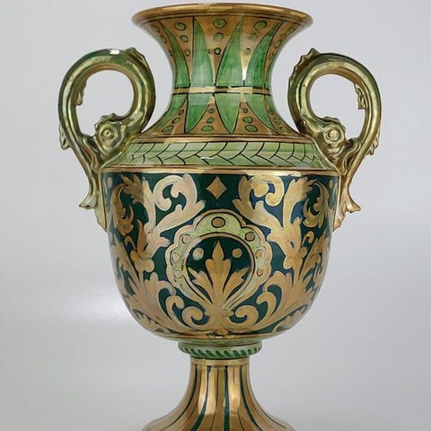 Vaserne viser en raffineret langstrakt balusterform, dekoreret med stiliserede geometrisk-florale motiver i