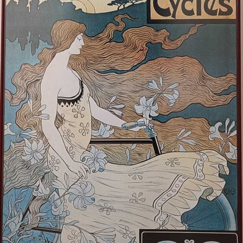 Fransk reklamplakat dedikeret til cyklen ”Sanpène”, kendetegnet ved en livlig humoristisk scene med en cyklist og en passager, udført i en illustrativ stil typisk for begyndelsen af det tyvende århundrede.