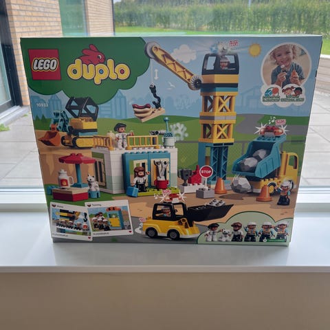 LEGO DUPLO byggesæt byggeplads med kran og lastbil. Sættet indeholder en stor kran med nedrivningskugle, lastbil, mindre køretøj, bygningselementer, klodser formet som sten, skovl, trafikkegle, byggepladsskilte samt flere DUPLO-figurer med sikkerhedshjelme. De store DUPLO-klodser er velegnede til mindre børn og kan kombineres med andre LEGO DUPLO sæt.