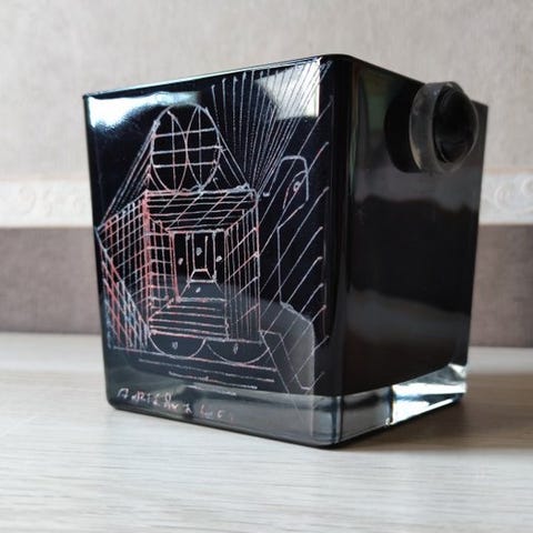 Formet glasbordskasse med forhøjning LUMAX RECUIT, sjældent XL-model designet af Le Corbusier og Charlotte Perriand for Lumax, fra 1950–1960, målene 15 × 15 × 8 cm, vægt 1.894 g, i fremragende stand. Klik på den blå "gå til varen" knap, for at købe eller byde på denne vare. Den samlede pris vil blive vist inden du afgiver dit bud.