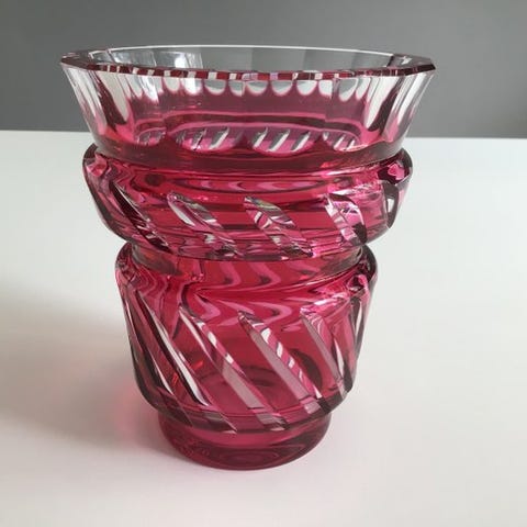 Art Déco-glasvase i klart presset glas, model Roméo fra Luxval-linjen til Val Saint Lambert (Belgien), højde 22 cm, bredde 19 cm, dybde 12 cm, vægt 2 kg, i god stand med let slid på grund af alder og Luxval/Val Saint Lambert signatur. Klik på den blå "gå til varen" knap, for at købe eller byde på denne vare. Den samlede pris vil blive vist inden du afgiver dit bud.