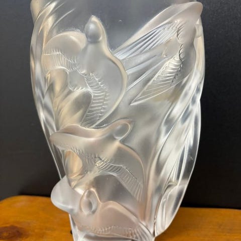 Fremstillet i presset krystal med satinfinish, beriget af polerede områder, tiltrækker værket med blidheden i sine former, den delikate behandling af fjerdragten og den store enkelhed i