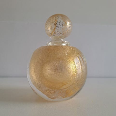 Udført med mesterlighed gennem de traditionelle muranske teknikker zanfirico og latticino, adskiller denne parfume flaske sig ved sit enestående lodrette stribemønster, der fremviser en netlignende tekstur inde i de hvide sektioner, hvilket forstærker dens skønhed.