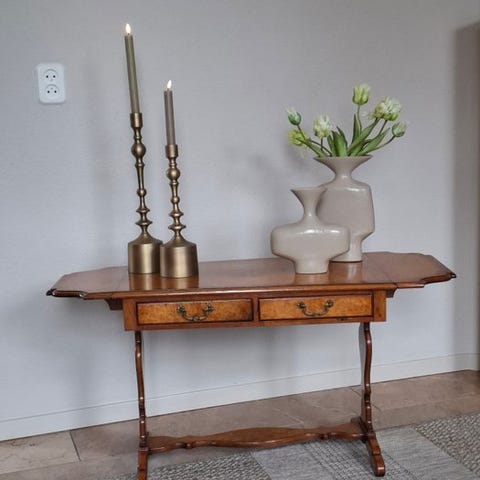 Italiensk træ sofabord fra 1970’erne i brunt, Luigi XV/Napoleon III overgangsstil, med tre skuffer med bronze ringhuse, bronze dekorationer og et top med geometrisk rombemønster; i god brugt stand med mindre tegn på alder. Klik på den blå "gå til varen" knap, for at købe eller byde på denne vare. Den samlede pris vil blive vist inden du afgiver dit bud.