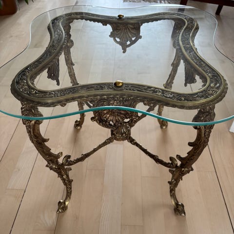 Det drejer sig om et antikt natbord eller et lille sidebord, ofte beskrevet som i Louis XV- eller Napoleon III-stil. Møblet er kendetegnet ved geometriske inlæg, buede ben (cabriole) og applikationer i forgyldt bronze.