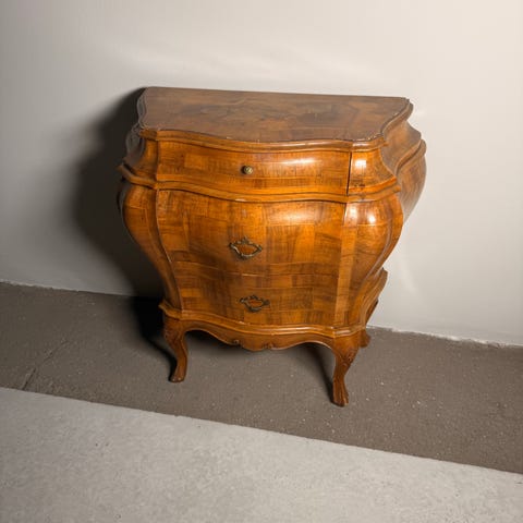 Møblet hviler på smykkede buede ben og er udstyret med elegante bronzefarvede skuffehåndtag.