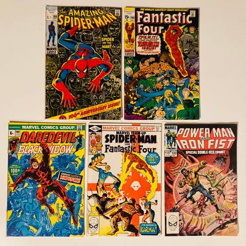Ni Marvel-tegneser fra 1968–1978, Første udgave og hæftning med stift, i Very Fine til FN+-stand, inklusive Sub-Mariner #4, Defenders #17, Spectacular Spider-Man #21, Daredevil #66, Iron Man #84, Tales of Suspense #97, Hulk #114, Avengers #161 og Thor #198, med første optrædener af Thunderball, Bulldozer og Whiplash og med kunstnere Stan Lee, John Buscema, Sal Buscema, George Perez, Mike Esposito, Len Wein og Herbe Trempe. Klik på den blå "gå til varen" knap, for at købe eller byde på denne vare. Den samlede pris vil blive vist inden du afgiver dit bud.
