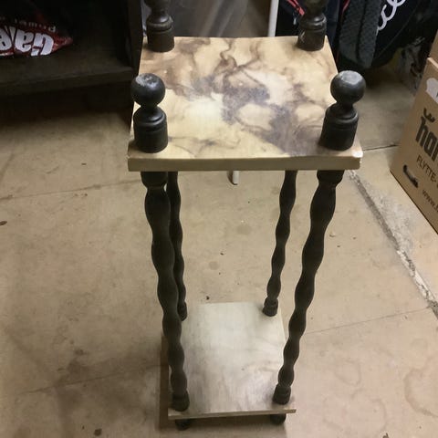Rundt træhøjstativ med marmorplade og gyldent finish, dateret 1960–1970; højde 60 cm, diameter 35 cm; i god brugt stand med mindre slid. Klik på den blå "gå til varen" knap, for at købe eller byde på denne vare. Den samlede pris vil blive vist inden du afgiver dit bud.