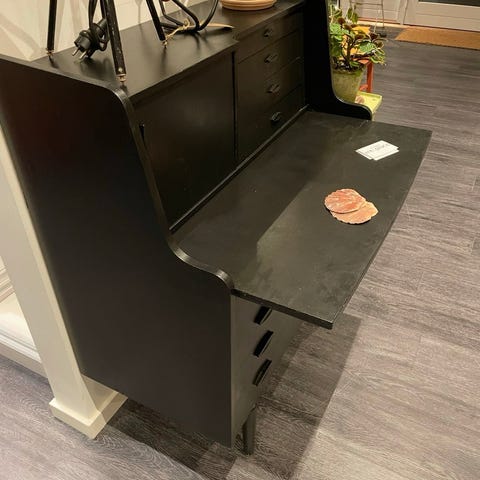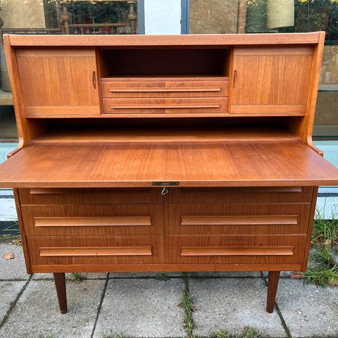 Den nederste del består af tre brede skuffer, mens den øverste klap, når den åbnes, afslører en praktisk skrivebordsflade med to små indvendige skuffer og buede nicher til dokumenter og genstande. Indersiden, færdig i naturtræ, skaber en elegant kontrast til den lakkerede yderside.