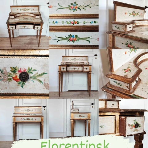 Italiensk træskrivebord i veneziansk stil fra 1950’erne, med lås og i god, brugt stand med normale alders- og brugsspor, cirka 88 cm høj, 65 cm bred og 40 cm dyb. Klik på den blå "gå til varen" knap, for at købe eller byde på denne vare. Den samlede pris vil blive vist inden du afgiver dit bud.