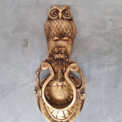 Et iøjnefaldende gotisk dørhammer med en detaljeret gargoylemaske og en ældet verdigris-patina. Gargoyler har gennem århundreder symboliseret beskyttelse og blev traditionelt placeret på bygninger for at afværge ondskab og beskytte hjemmet. Dette imponerende stykke forener middelalderligt præg med en dristig dekorativ effekt, hvilket gør enhver indgang uforglemmelig. Et ægte statement-stykke for elskere af historie, mysterier og tidløs arkitektur.
