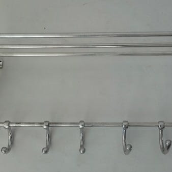 To væghængere i aluminium og metal med bevægelige plastikhager langs skinnen, fremstillet i Polen af Fabryka Wyrobów Metalowych (Stojadły) i 1960-1975, i meget god brugt stand efter renovering, længderne 72 cm og 44,5 cm med vægmonteringshuller. Klik på den blå "gå til varen" knap, for at købe eller byde på denne vare. Den samlede pris vil blive vist inden du afgiver dit bud.