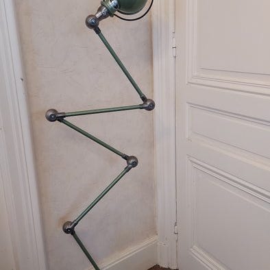 Jieldé justerbar industriel lampe fra Lyon, Frankrig, designet af Jean-Louis Domecq og produceret af Jielde, grøn metal- og stålkonstruktion, 180 cm høj med 40 cm lange arme, 20 cm dyb og bred, én fatning, 7 kg, dateret til 1950–1960, i god brugt stand og i funktion, smukt restaureret. Klik på den blå "gå til varen" knap, for at købe eller byde på denne vare. Den samlede pris vil blive vist inden du afgiver dit bud.