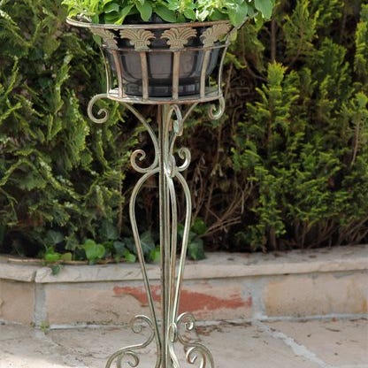 Metalkrukke planteholder, 80 cm høj med et 26 x 26 cm fodaftryk, fra Tyskland, estimeret periode 2010–2020, antikgrønbrun farve med barokdekorationer, ubrugt, som ny. Klik på den blå "gå til varen" knap, for at købe eller byde på denne vare. Den samlede pris vil blive vist inden du afgiver dit bud.