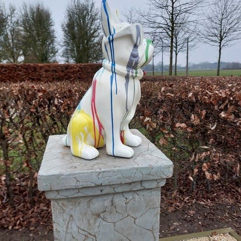 Håndmalet hund i polyresin, højde 60 cm, bredde 31 cm, dybde 43 cm, oprindelse Europa, i fremragende stand, uden underskrift. Klik på den blå "gå til varen" knap, for at købe eller byde på denne vare. Den samlede pris vil blive vist inden du afgiver dit bud.