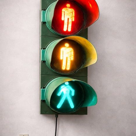 Vintage trafikl lys fra 80'erne, originalt, produceret af firmaet LA SEMAFORICA i Padova, fuldt funktionsdygtigt, koblet sådan at alle tre farver lyser samtidig, men når det ønskes kan det ændres meget nemt efter behov. Fremragende som bordlampe i industriel stil.