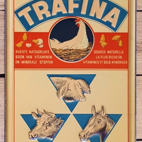 Dette antikke tin-skilt daterer sig fra 1937 og blev fremstillet i Belgien af det Bruxelles-baserede firma Jofico. Det er et sort reklameskilt med milde gule bogstaver og et enkelt design.