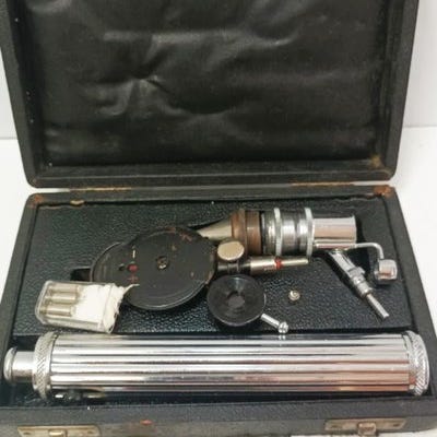 Sjælden violetstråleapparat fra Frankrig, lavet af metal, glas og bakelit, fra 1930–1940, i rimeligt god brugt stand med mindre mangler. Klik på den blå "gå til varen" knap, for at købe eller byde på denne vare. Den samlede pris vil blive vist inden du afgiver dit bud.