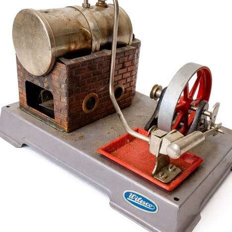 WILESCO vintaged stasjonær dampmaskine-model lavet i Tyskland i 1950’erne/1960’erne, med aluminiums-, jern- og messingkomponenter, vægt 2,3 kg og dimensionerne 25,5 × 19 × 20,5 cm, i god brugt kosmetisk stand med normale ældningstegn; beholderen af stål, sikkerhedsventilen, dampafbryderen, smøreren, vertikal cylinder med kassettedistribution og en metalle flywheel med messingkant er til stede, og det er komplet og sandsynligvis funktionelt, men funktionaliteten er ikke garanteret. Klik på den blå "gå til varen" knap, for at købe eller byde på denne vare. Den samlede pris vil blive vist inden du afgiver dit bud.