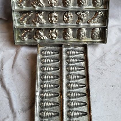 Smuk samling af forskellige chokoladeforme og pralineforme, brugt af chokolatører/konditorer.