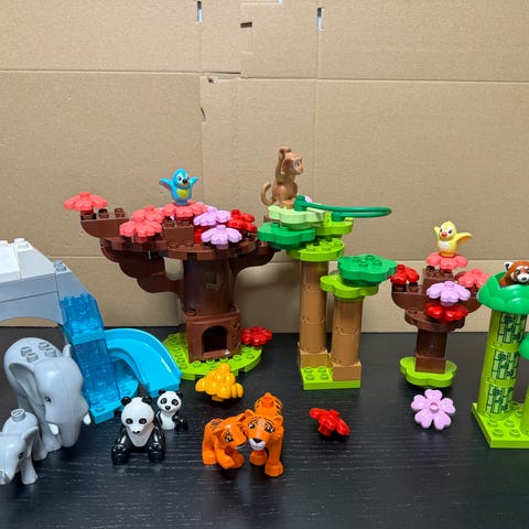 LEGO DUPLO togdyr med farverige dyrefigurer. Sættet består af saml-selv dyr på hjul, blandt andet elefant, giraf, løve og krokodille samt en klods med bananmotiv. Klodserne er store og beregnet til små børn, så de er nemme at holde om og bygge med. Dyrene kan sættes sammen på forskellige måder og køres som en række vogne på hjul.