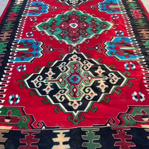 Smukt håndknyttet tæppe (kelim) af uld, hvor ulden er naturligt farvet uden kemikalier. Hovedfarverne er creme og sort. Tæppet er med en smuk, professionel og stram knytning og har korte frynser.