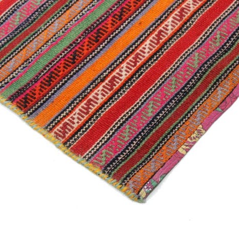 Dette farverige pakistanske Kelim er lavet i traditionelt håndarbejde. Typisk for denne type tæpper er de lyse farver og geometriske stribemønstre, der dannes gennem fladvæv.