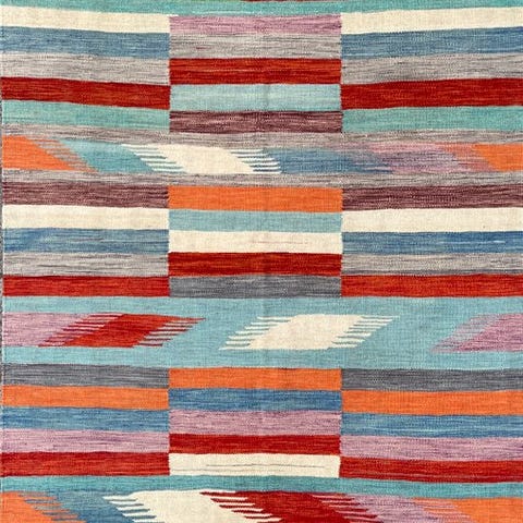 De Kelim er helt ny og ubrugt. Den traditionelle produktionsmetode og det høje niveau af håndværk, der er nødvendigt ved produktionen af disse tæpper. Alle vores Kelims og tæpper er unikke, og vi har kun ét stykke af hver.