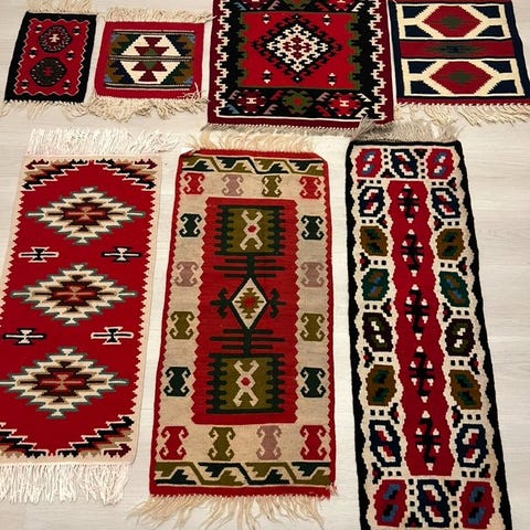 Til salg er et håndknyttet anatolsk orientalsk tæppe – Kilim Sumak – 1,45x1,12m, fra 1950'erne/60'erne. Velegnet til kendere og samlere. Det er lige til at hænge op. Det er velegnet som vægophæng.