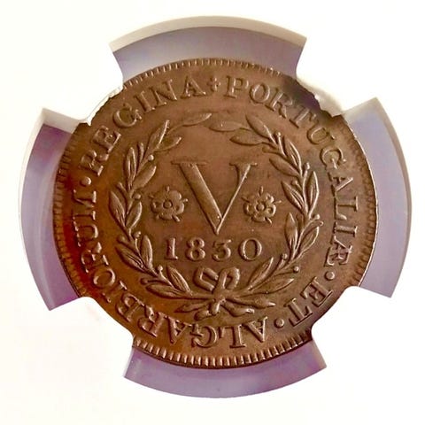 80 Reis Maluco mønt fra Azorerne, Portugal, 1829 med D. Maria II, data med punkt, vurderet af NGC som AU Details med skramme på obverse; bronze, 35 g, Ø 42 mm. Klik på den blå "gå til varen" knap, for at købe eller byde på denne vare. Den samlede pris vil blive vist inden du afgiver dit bud.