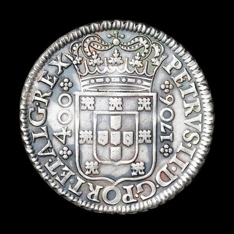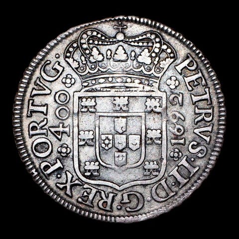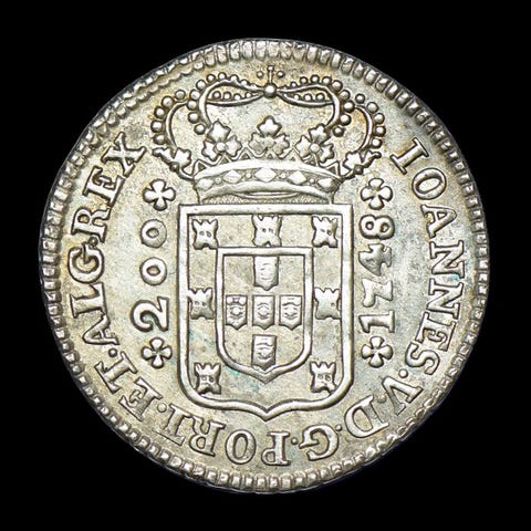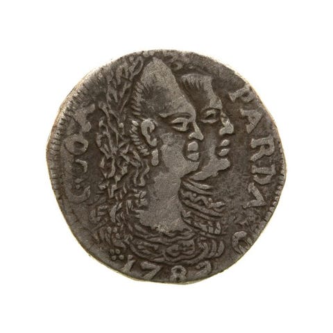 Portugisisk sølv Cruzado Novo (480 Reis), 1784 Coroa Alta, vægt 14,47 g, diameter 36,35 mm, AG 18,13, præget under D. Maria I og D. Pedro III. Klik på den blå "gå til varen" knap, for at købe eller byde på denne vare. Den samlede pris vil blive vist inden du afgiver dit bud.