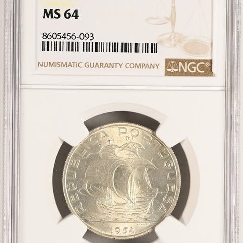 1948 1 Escudo fra São Tomé og Principe, bedømt GENI MS64, i alpaka, vægt 8,34 g, diameter 26,75 mm, certificeret AF88DYLYSE. Klik på den blå "gå til varen" knap, for at købe eller byde på denne vare. Den samlede pris vil blive vist inden du afgiver dit bud.