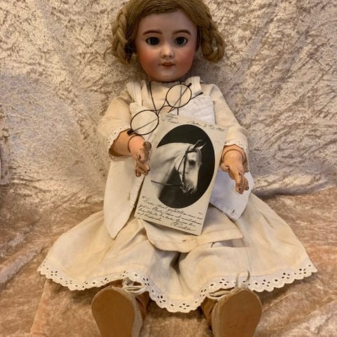 Smuk tidlig fransk dukke 55 cm, bisque hoved mærket: DÉPOSÉ SFBJ 8, faste støbte brune øjne, åben mund med tænder, gennemstikkede ørekanaler. Ledet Jumeau- krop med originalt klistermærke: Bébé Jume (au- mangler). Æresdiplom. Venstre hånd lidt ældningstegn og en lodret streg nederst på kroppen. Original paryk. Original blomsterkjole, gammel hat med tilhørende gammel kappe med enkelte aldersmærker. Sko nr 8