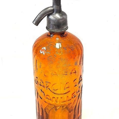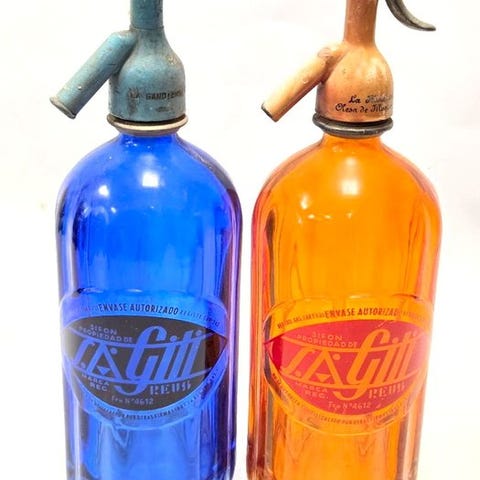 Vintage sifon fra Spanien i glas, anslået periode 1960–1970, et sæt på fire sifoner i forskellige modeller, mål 30 cm i højden, 10 cm i bredden og 10 cm i dybden, i god brugt stand med aldersrelaterede tegn og imperfektioner. Klik på den blå "gå til varen" knap, for at købe eller byde på denne vare. Den samlede pris vil blive vist inden du afgiver dit bud.