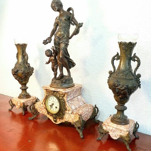 Denne franske pejsebesætning stammer fra det 19. århundrede og er karakteristisk for Empire- eller Napoleon III-stilen. Hele sætningen inkluderer en central ur i rød marmor, udsmykket med gildede bronzer, og to matchende kandestager, sandsynligvis udstyret med et Japy Frères-urværk, en velrenommeret fransk urfabrikant fra tiden.
