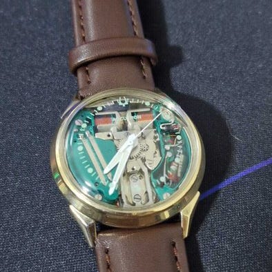 Bulova Accutron Spaceview-Révisée 214, fremstillet i 1969, guldfyldt 10 karat kasse, diameter 35 mm, urværk Autre, brun læderrem, ingen original æske eller papirer, urskive ikke genmalet, batterihullet kan åbnes og ny batteri installeret, i gang og fuldt service i januar 2026. Klik på den blå "gå til varen" knap, for at købe eller byde på denne vare. Den samlede pris vil blive vist inden du afgiver dit bud.