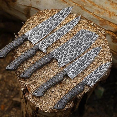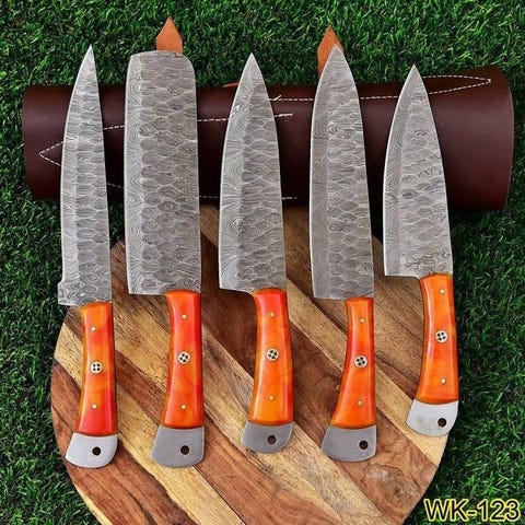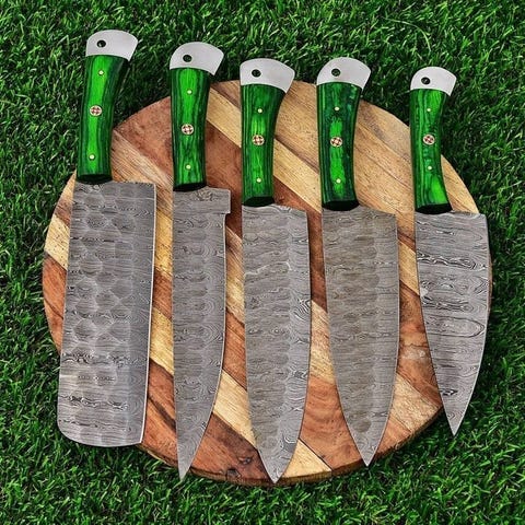 Smukt matchende sæt af fem håndlavede køkkenknive, fremstillet af mønstret Damascus-stål. Hvert blad viser et attraktivt lagdelt stål mønster, resultatet af traditionelle smedeteknikker. Sættet dækker et bredt udvalg af køkkenopgaver, fra tung hakning til fin skæring.