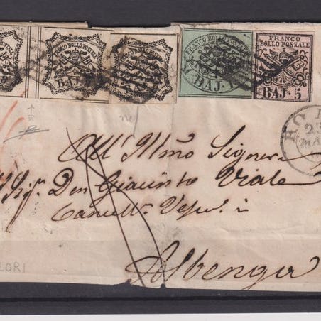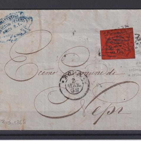 Geografisk oprindelse: Antichi Stati italiani - Stato Pontificio, 1852, Lettera affrancata in Porto Assegnato da Valentano a Ischia di Castro, anvendt til post, katalogiseret som Sassone nr. 2 og 6 (Euro 6.110), med ekspertudtalelse underskrevet af Sorani. Klik på den blå "gå til varen" knap, for at købe eller byde på denne vare. Den samlede pris vil blive vist inden du afgiver dit bud.