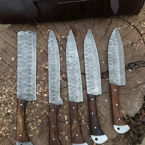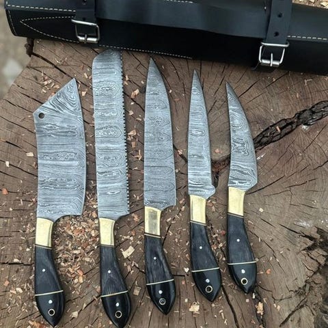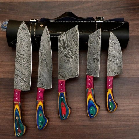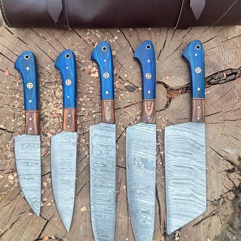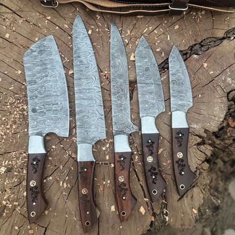 Dette er en bemærkelsesværdigt smedet og håndlavet køkkenkniv fremstillet af de fineste knivmager i USA. Dette er et meget flot håndlavet Custom Handmade Collectibles Chef Knives Set (5) med rosewood-håndtag, premium læderrulle. Kniven har et behageligt greb. Klingens stål er særligt smedet og har en høj skærekant. Denne kniv er lige så meget et samlerobjekt som et nyttigt køkkenredskab. Knivene har en cirka 34 cm længde.