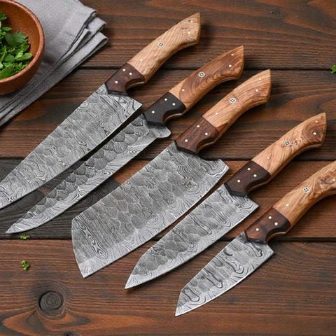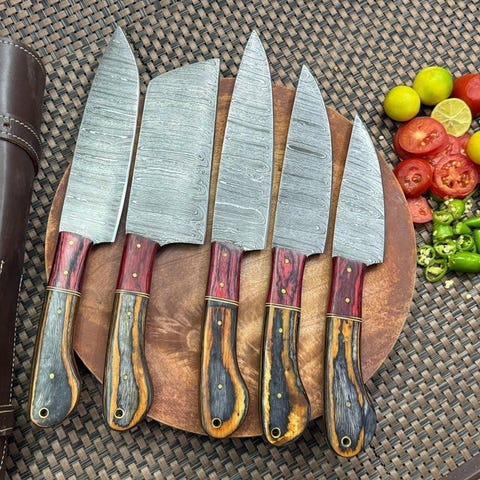Smukt matchende sæt af fem håndlavede køkkenknive fremstillet af mønstret stål. Hver klinge viser et tiltalende lagdelt stålmønster, resultatet af traditionelle smedeteknikker. Settet dækker et bredt udvalg af køkkenopgaver, fra kraftig hakning til finskæring.