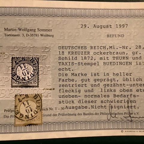 Fra Det Tyske Rige, emnet kaldet “Twee zegels uit Nothilfeblok en combinatie Wagner op brief - einwandfei gekeurd Schlegel” (Michel 509/510 og W53), fra 1933, i Gelopen-stand, med certifikat, katalogværdi €1.780 (Michel 2022). Klik på den blå "gå til varen" knap, for at købe eller byde på denne vare. Den samlede pris vil blive vist inden du afgiver dit bud.