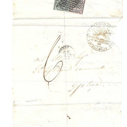 Brev fra Castel S.Giovanni til Milano, Italienske stater – Parma, 1852, brugt til post, med en stribe af tre 5-cent-frimærker og afstemplet med en rød dobbeltcirkel-stempel (Sassone R1); certifikat til stede. Klik på den blå "gå til varen" knap, for at købe eller byde på denne vare. Den samlede pris vil blive vist inden du afgiver dit bud.