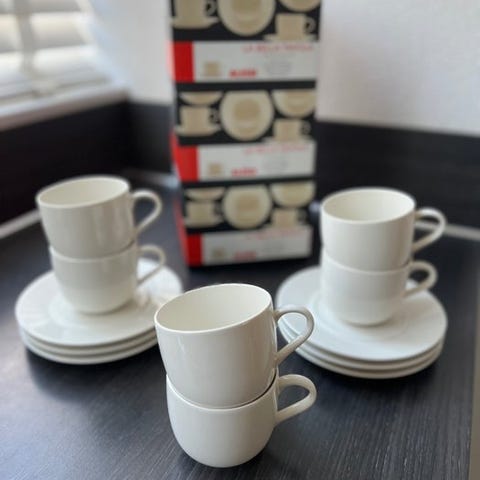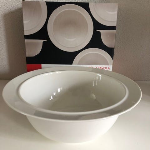 Elegant luksus sæt fra Alessi fra serien La Bella Tavola. Designet af Ettore Sottsass i 1993. Kollektionen er tidløs og af høj kvalitet. De er lavet af porcelæn med en blank finish og skaber en klassisk, raffineret middag på bordet. Både magnetron- og opvaskemaskinebestandig.