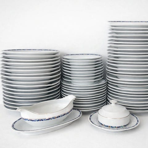 Elegant porcelænsservise fra Vista Alegre med et klassisk og tidløst design. Sættet er dekoreret i hvidt med sarte blå detaljer og fine gildede accenter langs kanten, karakteristisk for traditionelt portugisisk porcelæn.