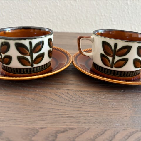 Et teservice til seks personer bestående af tekopper med tilhørende underkopper og underlag (i alt 18 dele), designet af Raymond Chevalier for Boch Keramis.