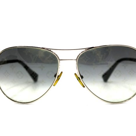 Rammen er i sølvfarvet metal, med logoinitialerne 'LV' langs omkredsen af fronten – Armene er i grafitbelagt stof med et damier-mønster, afsluttet med en del i sølvfarvet metal – Glasene har et knudemønster af reb, ikonisk for Christopher Nemeth.